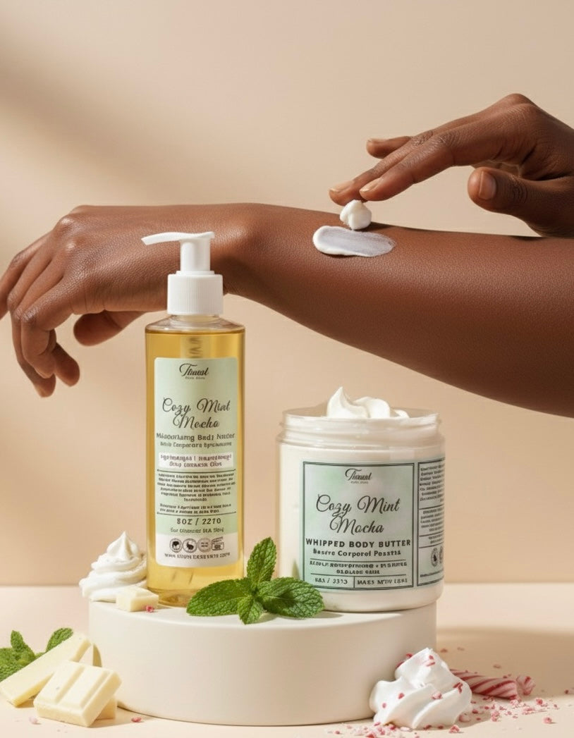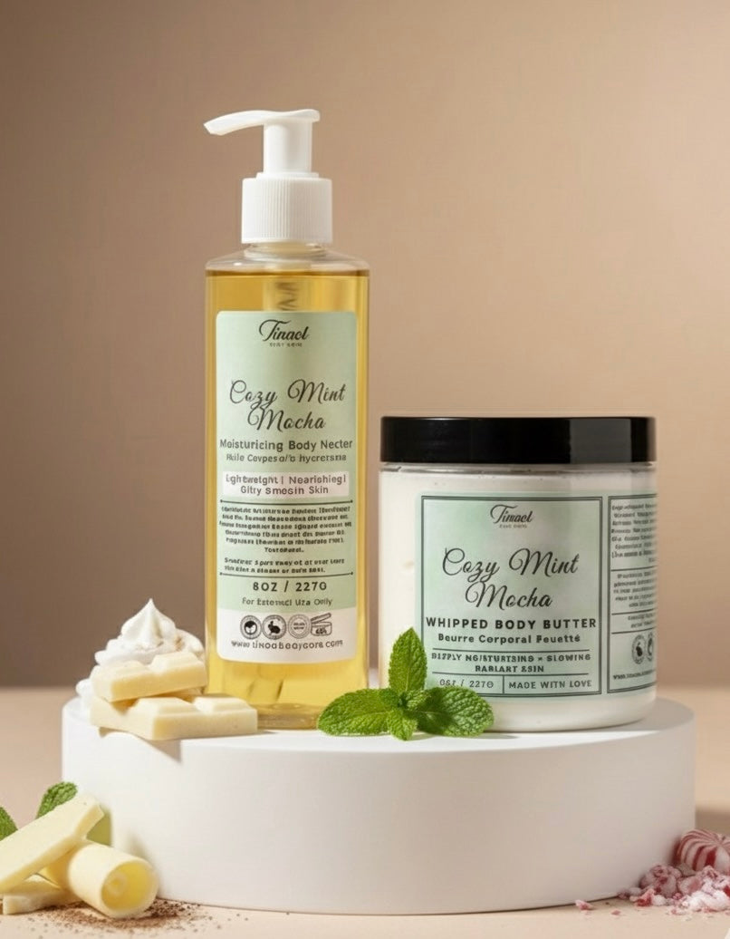 Cool, creamy, and oh-so-indulgent — this duo wraps your skin in a refreshing, minty-sweet experience that feels like a cozy café moment on a winter morning. It’s the perfect balance of invigorating and comforting, melting dryness away while leaving behind a soft, luxurious glow.